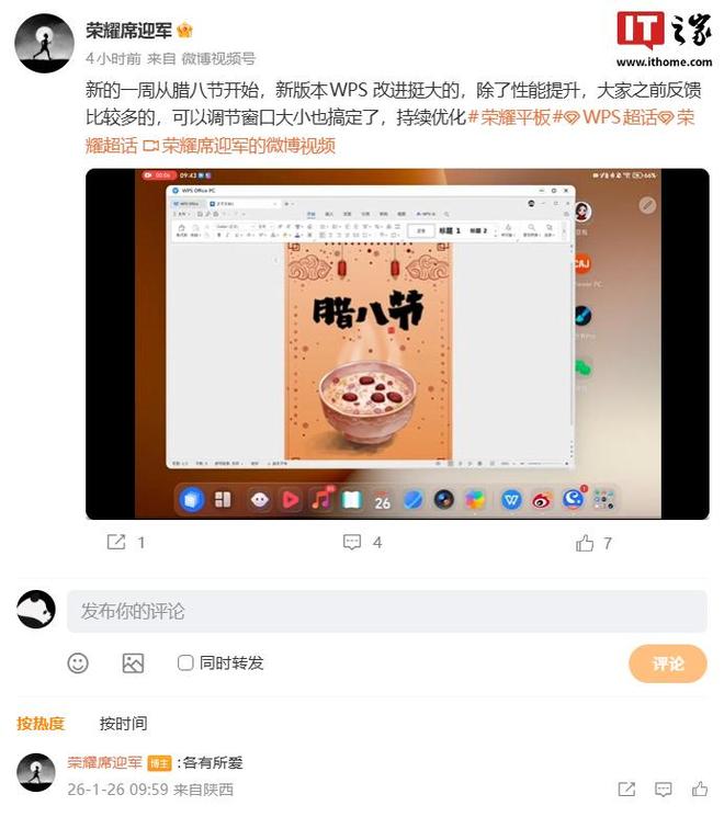 IT之家 1 月 26 日消息,据荣耀全场景软件主理人 @荣耀席迎军 今日分享,除了性能提升外,荣耀平板的 PC 级 WPS 也迎来大改进。他表示,用户之前反馈比较多的可以调节窗口大小已搞定百盛证券,后续还会持续优化。
