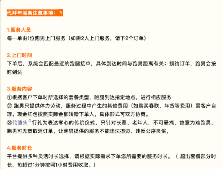 2月9日,UU跑腿App发文称上线拜年服务,其中代贴春联套餐69元,代拜年套餐199元,代拜长辈套餐999元,代拜长辈套餐包含代买年货、代送礼品、1分钟吉祥话祝福,行传统礼仪,实时视频直播和其他定制服务。在服务内容中写明,“代磕头行礼为表达孝心的传统仪式,只针对长辈、老年人,不可恶搞、故意为难跑男,跑男可无责取消订单。让跑男提供的服务不能违法擦边、违反公序良俗。”